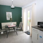 Dining Kitchen 4.43m x 2.65m Fitted wall and base units with coordinating work surfaces, sink unit, integrated electric oven, integrated gas hob, extractor hood, space for dishwasher, integrated fridge, double glazed window to rear and double glazed French doors leading to rear garden.