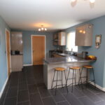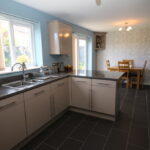 Dining Kitchen 2.98m x 6.45m Fitted wall and base units with coordinating work surfaces, sink unit, integrated electric oven, integrated gas hob, extractor hood, tiled floor, integrated fridge freezer, breakfast bar, radiator, double glazed window to rear and double glazed French doors leading to rear garden.