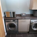 Utility Room 1.95m x 1.66m Fitted wall and base units with coordinating work surfaces, space for washing machine, space for tumble dryer, tiled floor, double glazed door to rear, radiator and cupboard housing boiler.