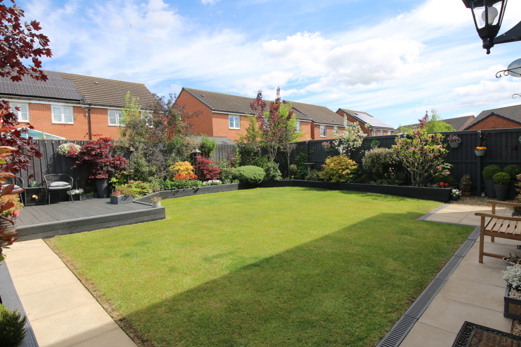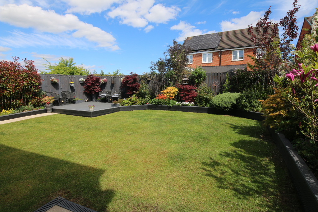 Rear Garden Laid to lawn with planted borders, paved patio area, raised decked area, fenced boundaries and gated access.