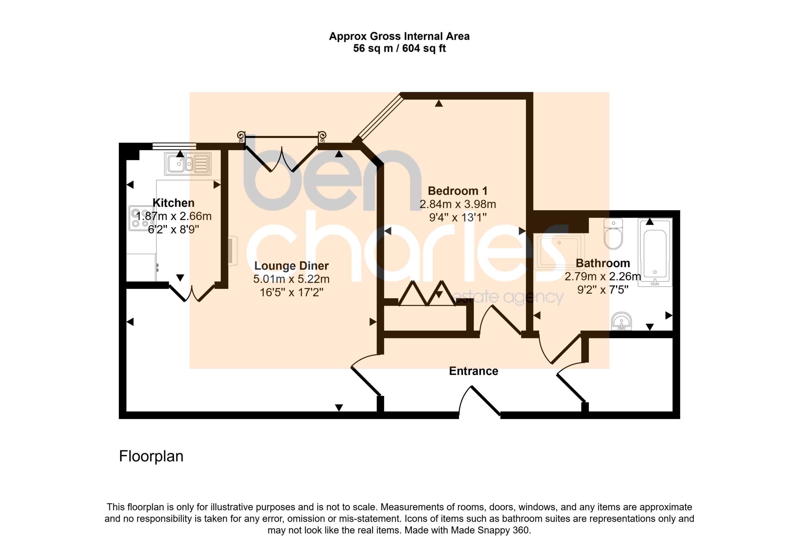 Kitchen 2.72m x 1.94m Fitted wall and base units with coordinating work surfaces, single drainer sink unit, integrated electric oven, integrated electric hob, extractor hood, integrated fridge freezer, wall heater, partially tiled walls and double glazed window to front.