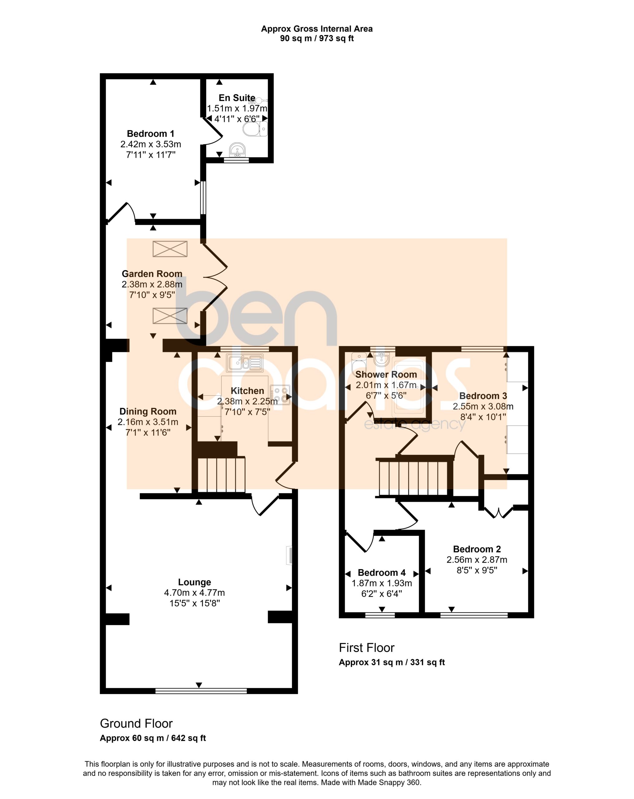 En-Suite Shower Room (Ground Floor) 1.51m x 1.97m White three piece suite comprising wash hand basin in vanity unit, low level WC, tiled walls, tiled floor, heated towel rail, walk in shower, double glazed window to front and extractor fan.