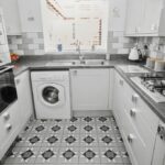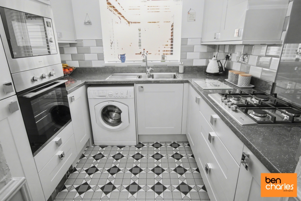 Kitchen 2.38m x 2.25m Fitted wall and base units with coordinating work surfaces, sink unit, integrated electric oven, integrated gas hob, extractor hood, space for washing machine, partially tiled walls, integrated fridge freezer, integrated microwave, partially tiled walls and double glazed window to rear.
