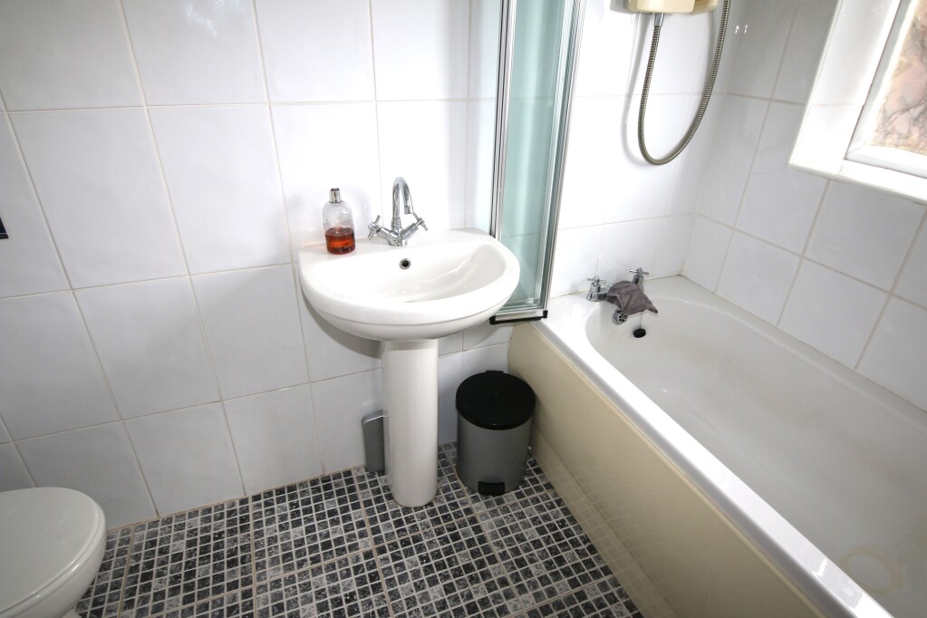 Bathroom 2.56m x 1.80m (max) Three piece suite comprising panelled bath with shower over, pedestal wash hand basin, low level WC, tiled walls, tiled floor, heated towel rail and double glazed window to rear.