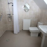 En-Suite Wet Room 2.06m x 2.02m White suite comprising shower, pedestal wash hand basin, low level WC, tiled walls, extractor fan, radiator and Velux window.