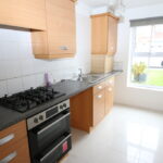 Kitchen 3.86m x 1.87m Fitted wall and base units with coordinating work surfaces, sink unit, integrated electric oven, integrated gas hob, extractor hood, space for washing machine, partially tiled walls, tiled floor, radiator and double glazed window to front.