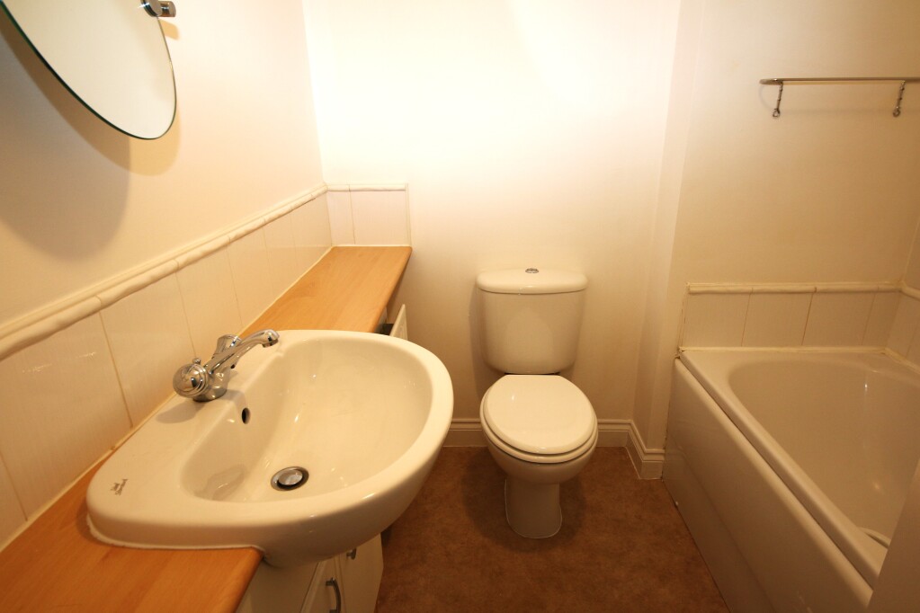 Bathroom 1.93m x 1.90m White three piece suite comprising panelled bath, wash hand basin in vanity unit, low level WC, partially tiled walls, extractor fan and radiator.