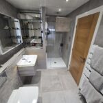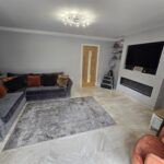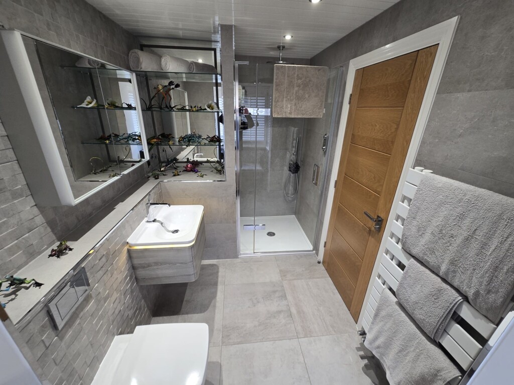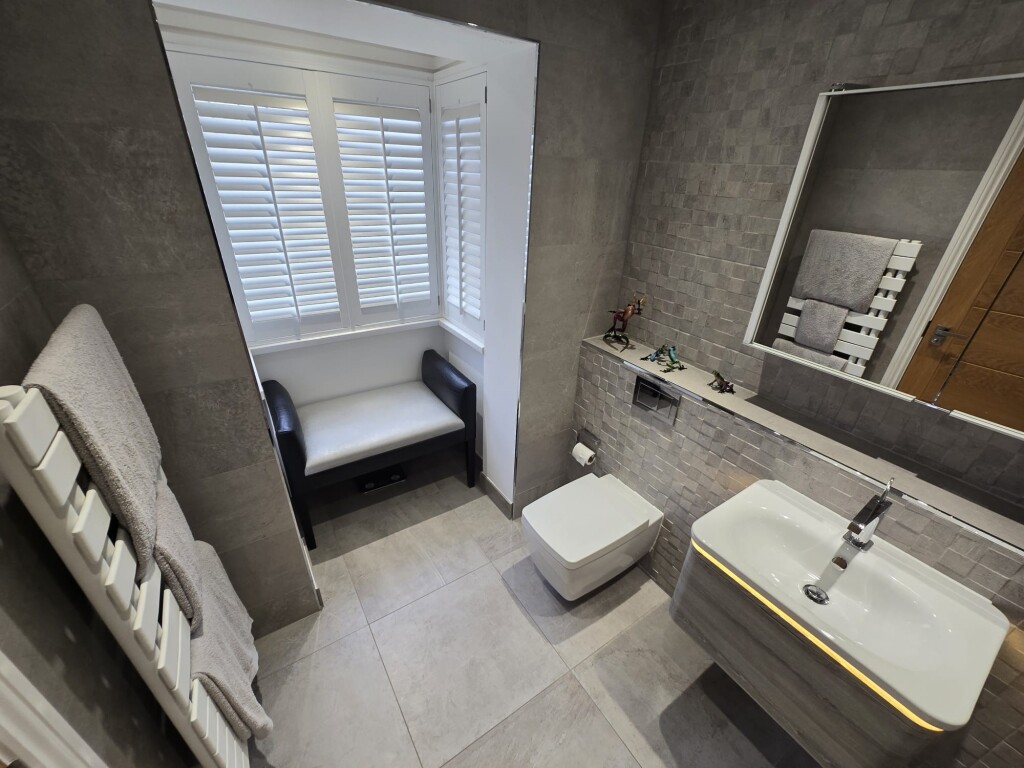 En Suite Shower Room 2.77m x 1.91m White three piece suite comprising: Step in shower, vanity unit housing wash hand basin, low level wc, heated towel rail, extractor fan, tiled floor, part tiled walls, radiator and double glazed window.