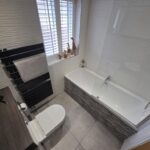 Family Bathroom 2.06m x 1.66m White three piece suite comprising: Panelled bath with shower over, vanity unit housing wash hand basin, low level wc, heated towel rail, extractor fan, tiled floor and walls, double glazed window.