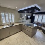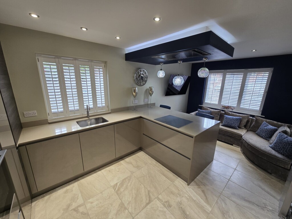 Dining Kitchen 5.00m x 2.97m Fitted wall and base units, coordinated solid work surfaces, single drainer sink, breakfast bar, built in electric oven, induction hob, extractor hood, integral microwave, fridge freezer, dishwasher and washer dryer, tiled floor, radiator and double glazed windows.