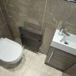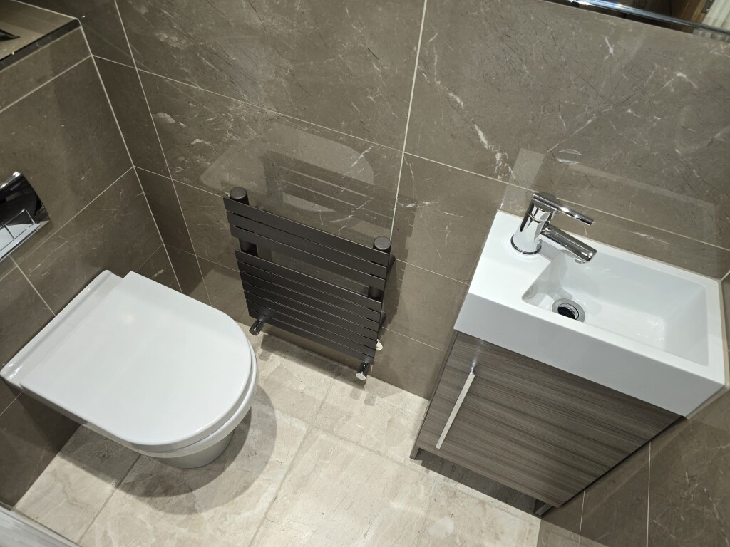 Cloakroom / WC 1.60m x 0.76m Low level wc, vanity unit housing wash hand basin, tiled floor, part tiled walls and radiator.