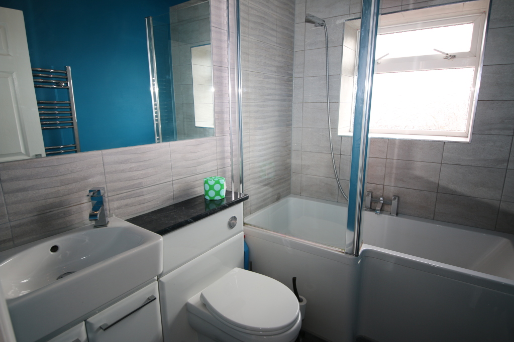 Bathroom 2.17m x 1.57m White three piece suite comprising panelled bath, wash hand basin and low level WC in vanity unit, partially tiled walls, heated towel rail and double glazed window to rear.