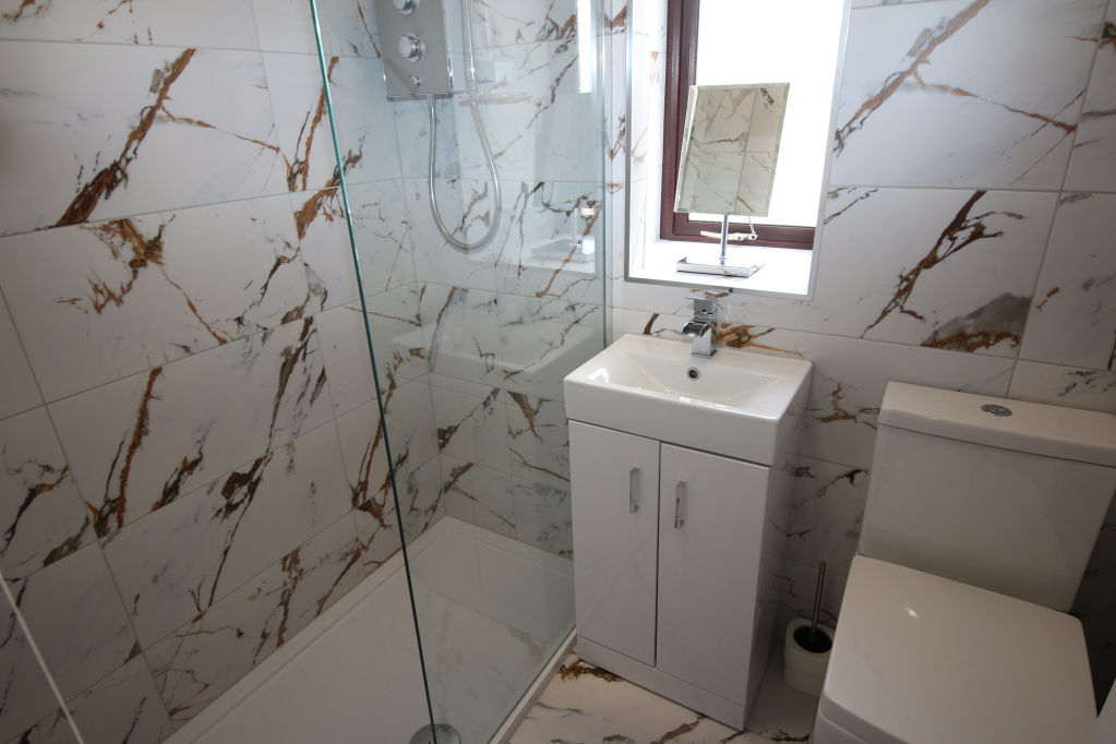 Shower Room 1.36m x 1.80m White three piece suite comprising wash hand basin in vanity unit, step in shower cubicle, low level WC, tiled walls, tiled floor, heated towel rail and double glazed window to rear.