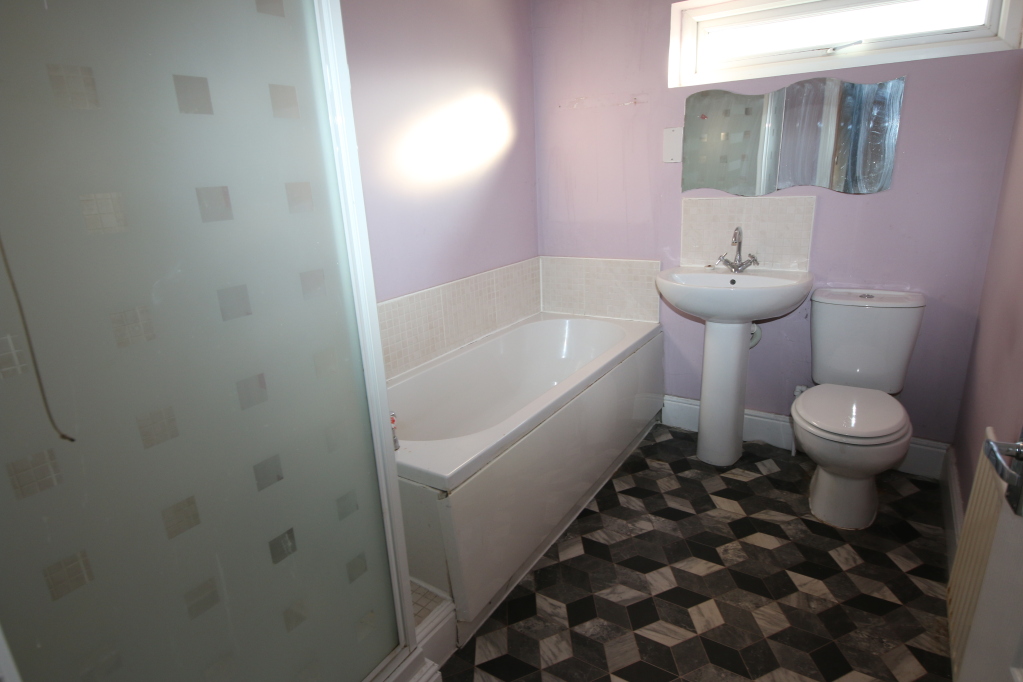 Bathroom 2.63m x 1.90m White four piece suite comprising panelled bath, pedestal wash hand basin, step in shower cubicle, low level WC, partially tiled walls, double glazed window to rear and radiator.