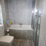 Bathroom 1.64m x 2.46m White three piece suite comprising panelled bath with shower over, low level WC and wash hand basin in vanity unit. heated towel rail. double glazed window to front and extractor fan.