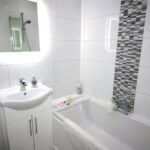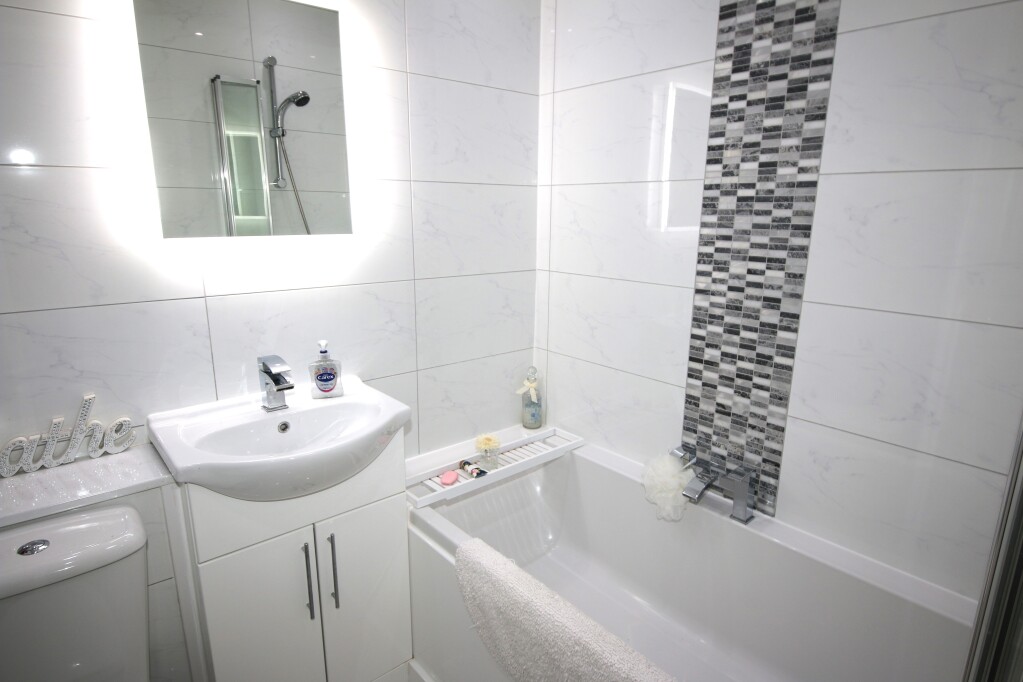 Bathroom White three piece suite comprising panelled bath with shower over, wash hand basin in vanity unit, low level WC, tiled walls, heated towel rail and extractor fan.
