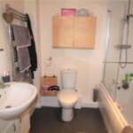 Bathroom 2.07m x 2.11m White three piece suite comprising panelled bath with shower over, wash hand basin in vanity unit, low level WC, partially tiled walls, heated towel rail and extractor fan.