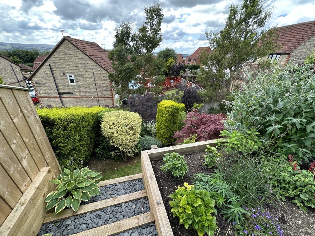 Rear Garden Laid to lawn with planted borders, outside tap, decked area, fenced boundaries and door to garage.
