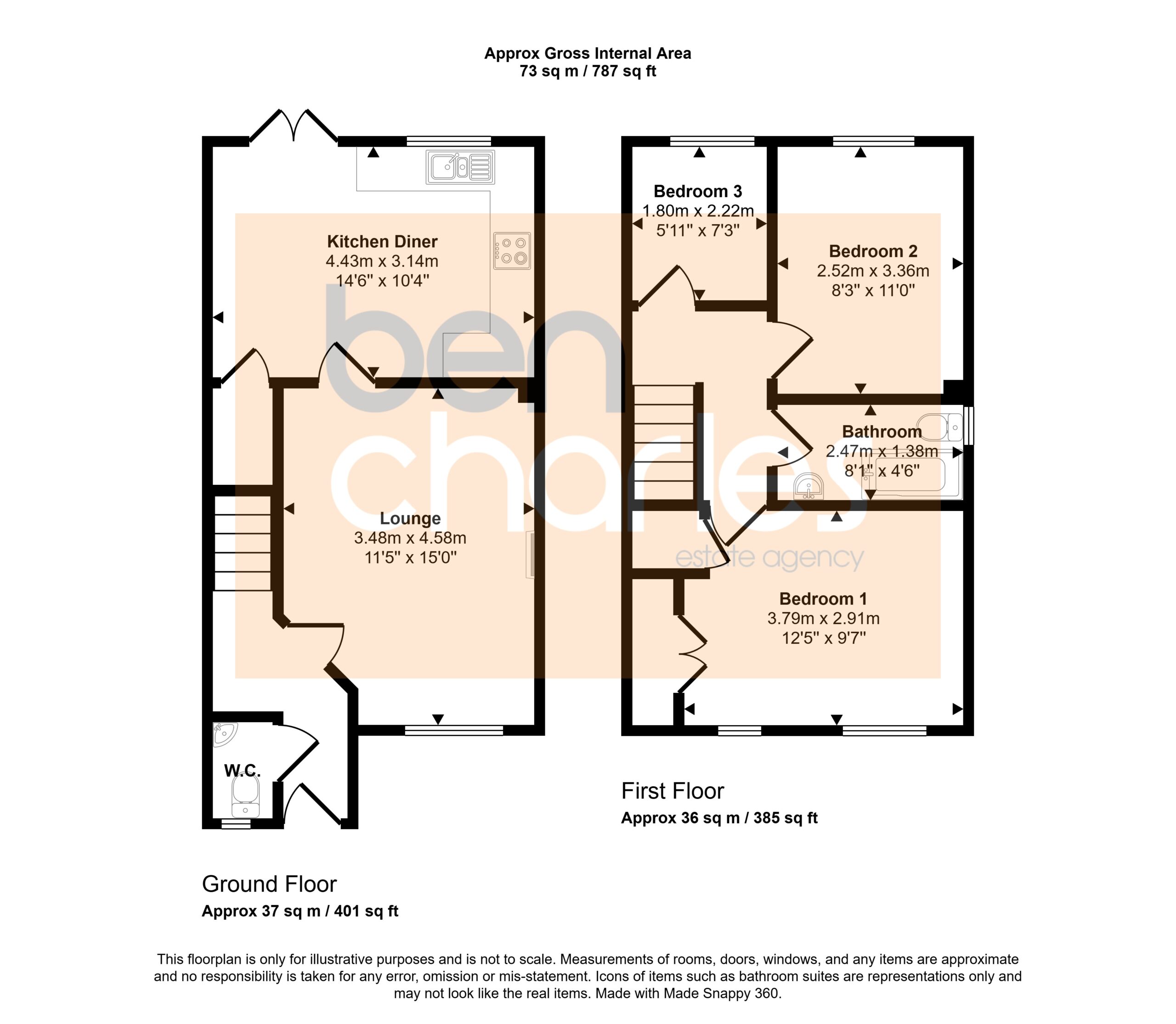 Bathroom 2.47m x 1.38m White three piece suite comprising panelled bath with shower over, pedestal wash hand basin, low level WC, partially tiled walls, double glazed window to side and radiator.