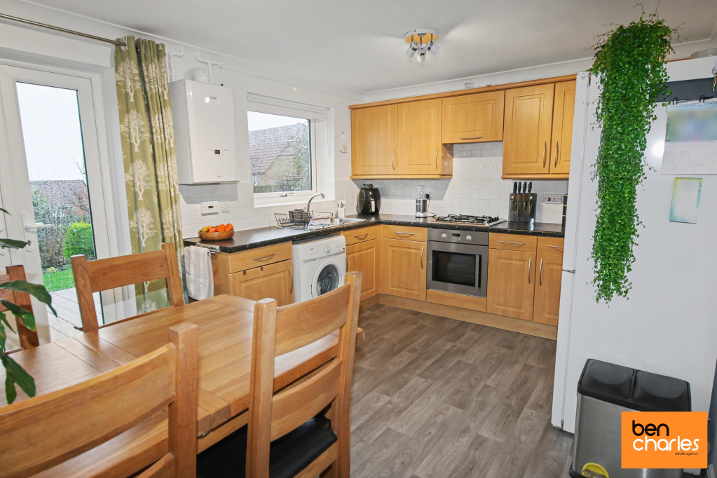 Dining Kitchen 4.43m x 3.14m Fitted wall and base units with coordinating work surfaces, sink unit, integrated electric oven, integrated electric hob, extractor hood, space for washing machine, partially tiled walls, radiator, under stairs cupboard, double glazed window to rear and double glazed French doors leading to rear garden.