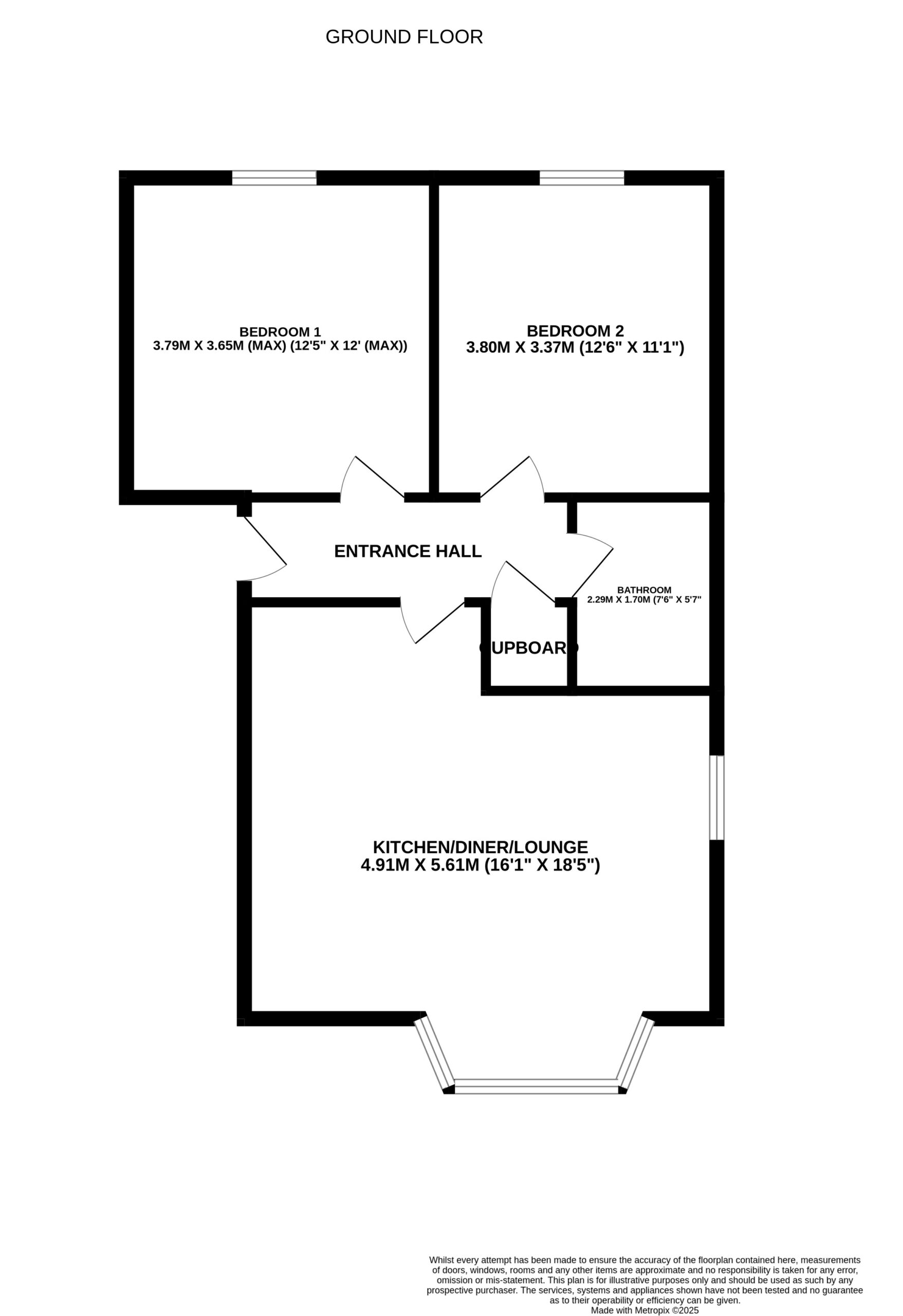 Living/Dining Room 4.91m x 5.61m Bay window to front, television point and two radiators.