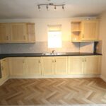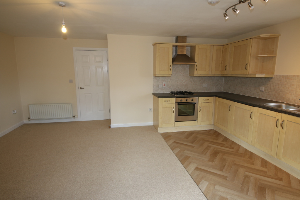 Kitchen Open to living dining space and comprising fitted wall and base units with coordinating work surfaces, sink unit, integrated electric oven, integrated gas hob, extractor hood, integrated washer/dryer and double glazed window to side.